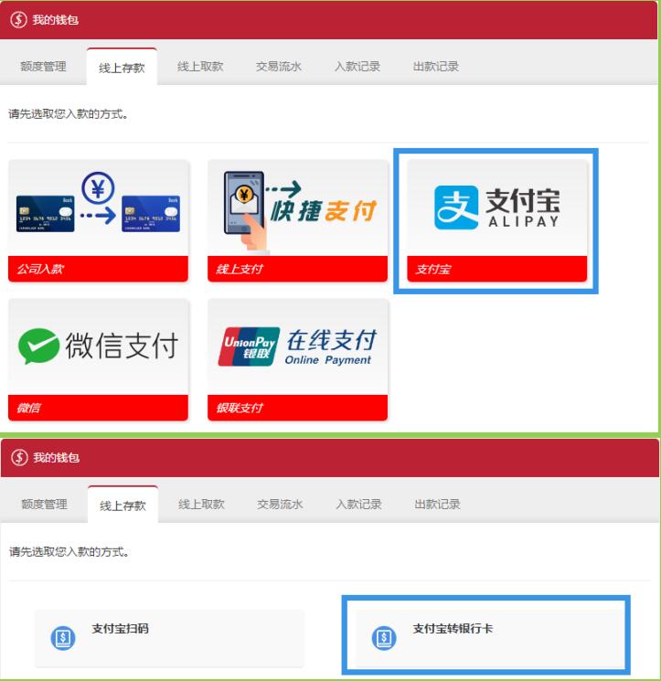 电脑用户点击右上角登入,登入会员账号,点击屏幕右上方的线上存款。再点击支付宝,选择支付宝转银行卡