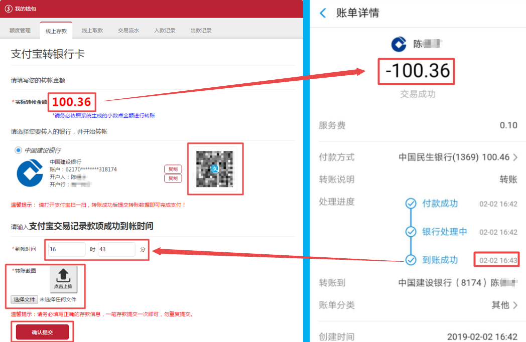 打开支付宝扫一扫,扫描入款页面中的二维码进行转账(此二维码只能使用一次,请勿重复使用并且转账金额务必与系统生成的小数点金额一致);到账成功后按照提示填写到账时间,并上传您的转账详情截图,在点击确认提交。(温馨提示:务必先确认到账后,填写准确到账时间,再点击提交,否则财务人员查询不到款项无法第一时间帮您添加额度。)